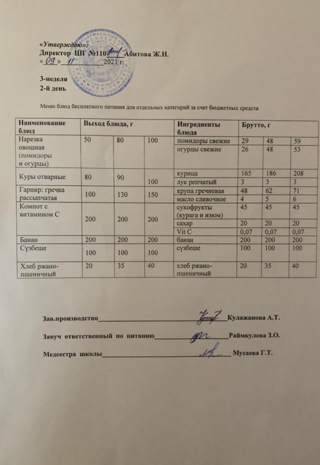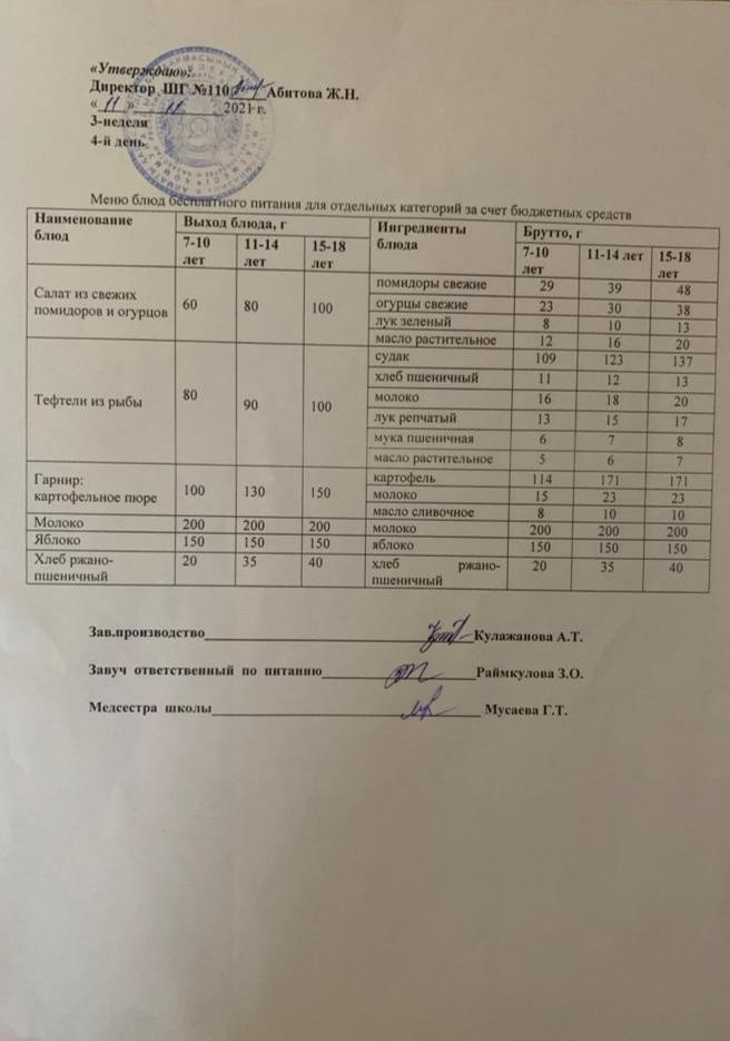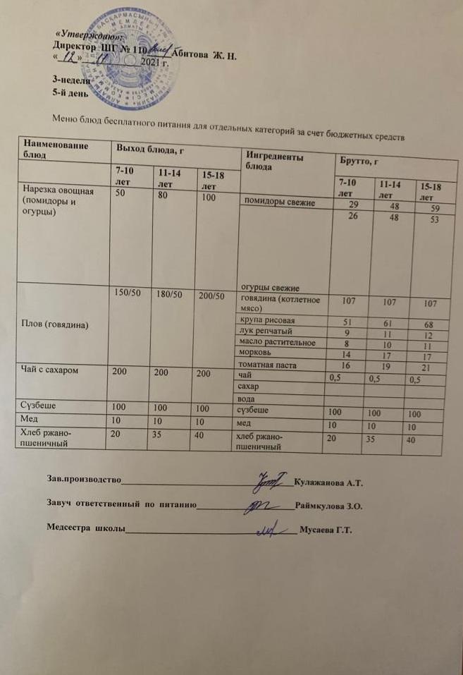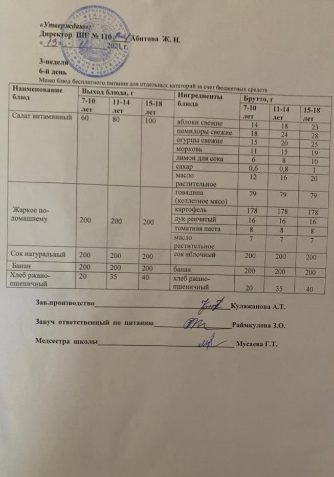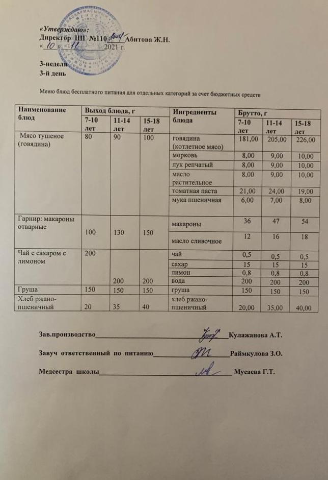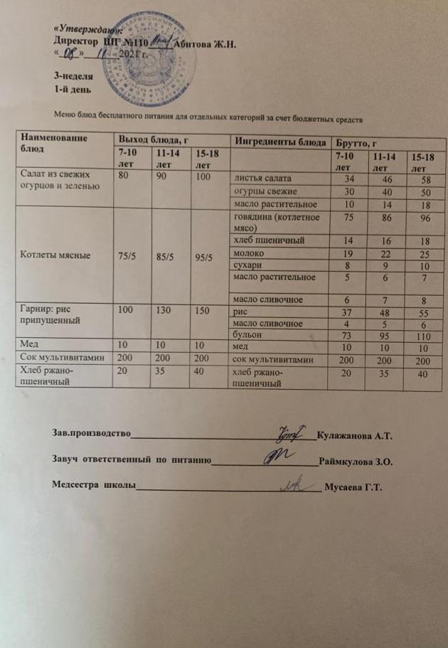 Меню блюд бесплатного питание для отдельных категорий