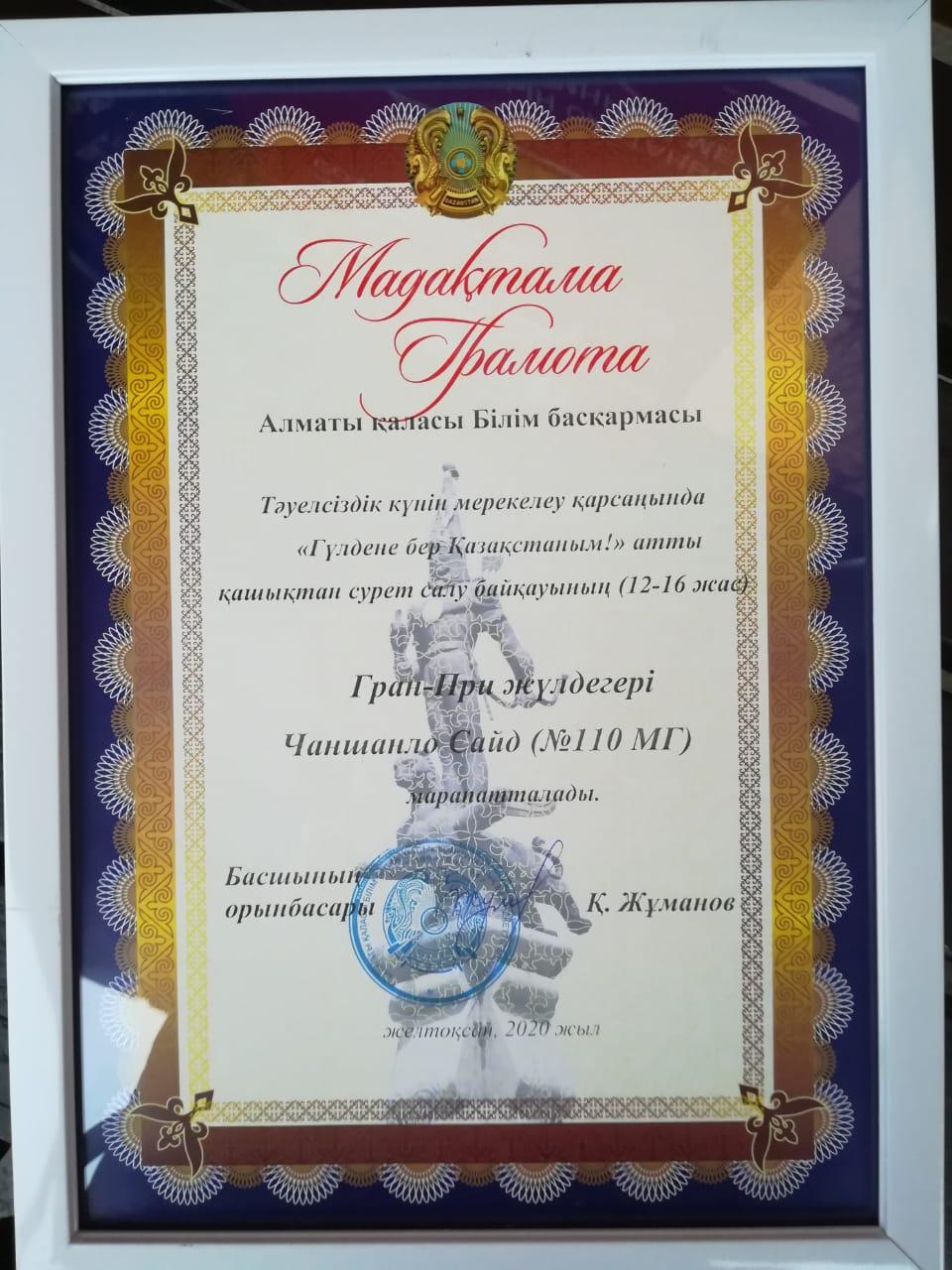 16 желтоқсан Тәуелсіздік күні мерекесіне орай, "Жасай бер менің Қазақстаным! атты қалалық сурет салу байқауына 8-г сынып оқушысы Чаншанло Саид"қатысып, "Бас Жүлдеге " ие болды және сыйлыққа планшет сыйлады. Дауыс беріп қолдау көрсеткендерыныз үшін алғыс білдіремін. Жеңіс құтты болсын!