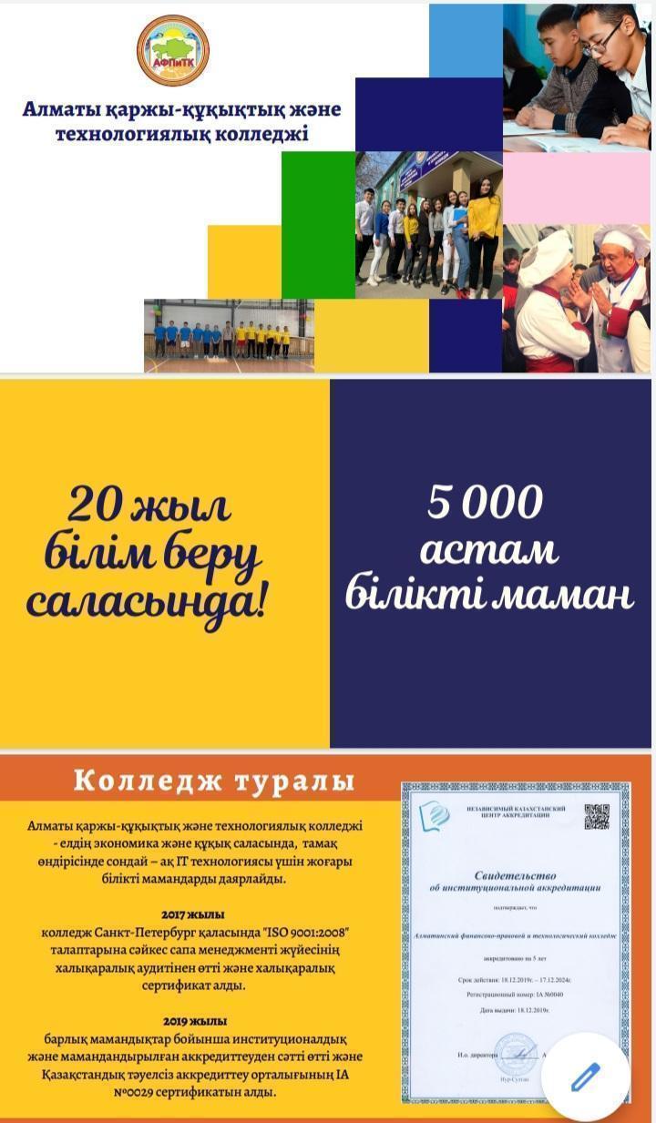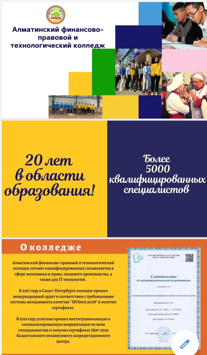 «Алматы қаржы-құқықтық және технологиялық колледжі» (бұдан әрі AFPTK) Сізге білім беру жүйесін дамытуға, жас ұрпақты тәрбиелеуге қосқан елеулі үлесіңіз үшін құрмет пен ризашылығын білдіреді.