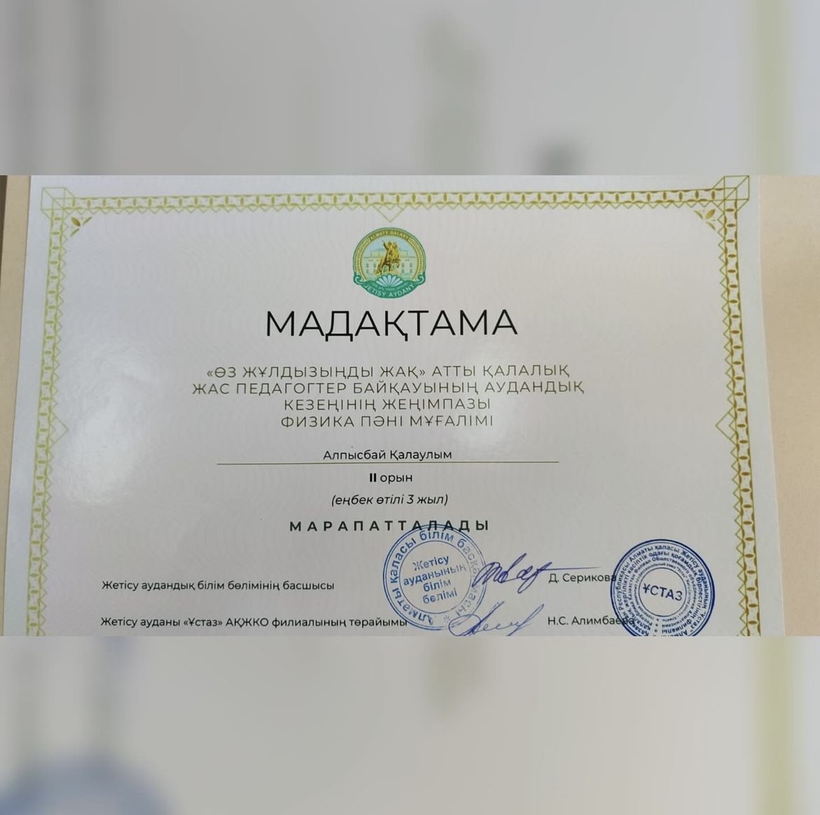 “Өз жұлдызыңды жақ” атты қалалық жас педагогтер байқауының аудандық кезеңінің жеңімпазы N110 мектеп-гимназияның физика пәні мұғалімі Алпыспай Қалаулым ІІ орынмен марапатталды. ҚҰТТЫҚТАЙМЫЗ!👏🏻👏🏻👏🏻