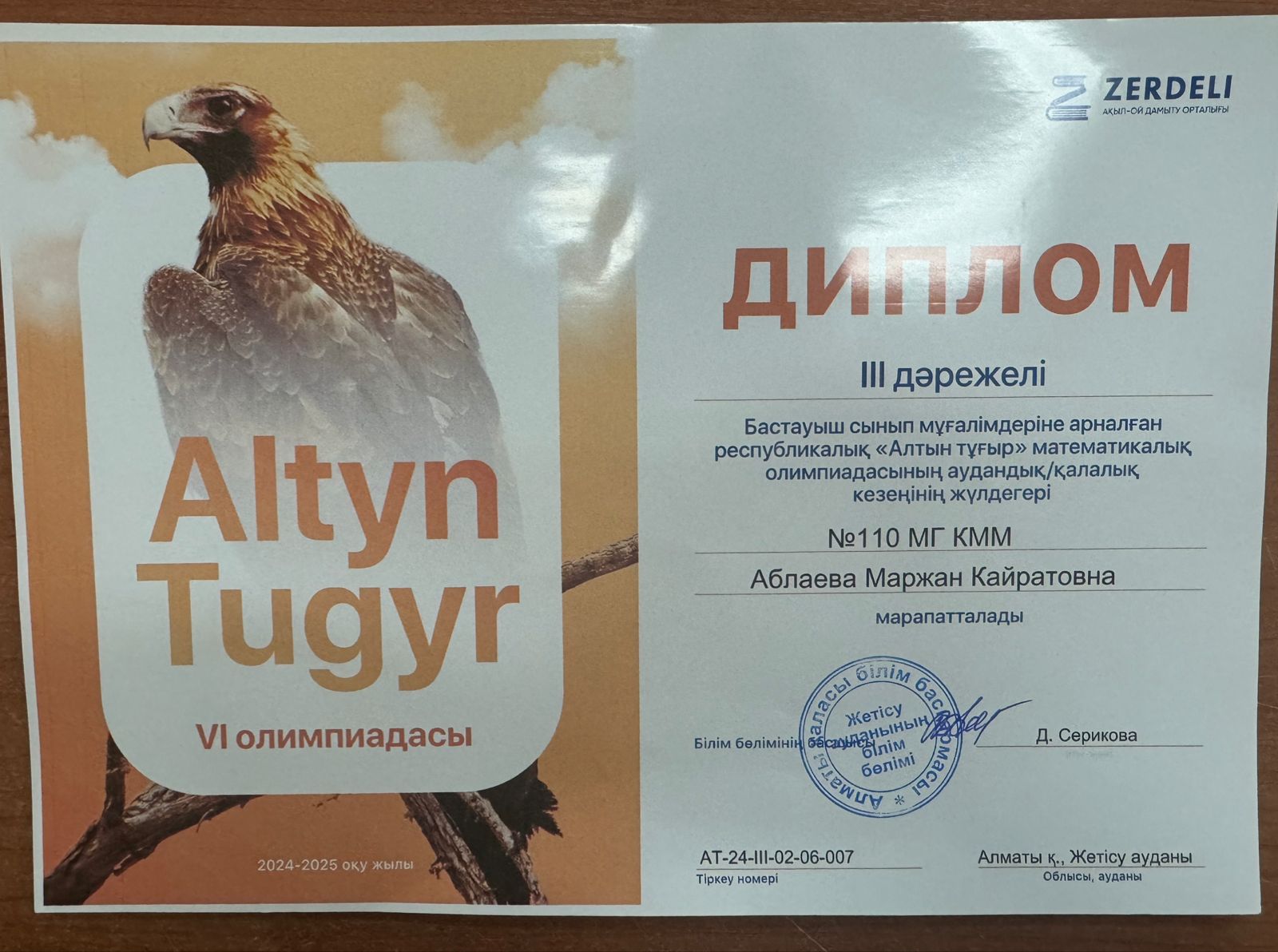 02 қаңтар 2025 0 1 2 3 4 5 «Алтын тұғыр» математикалық олимпиадасы 110 мектеп —гимназиясының бастауыш сынып мұғалімі Аблаева Маржан Қайратовна аудан арасында өткен республикалық «Алтын тұғыр» математикалық олимпиадасынан 3 дәрежелі дипломен марапатталды Осы беттің QR-коды:QR-код этой страницы: