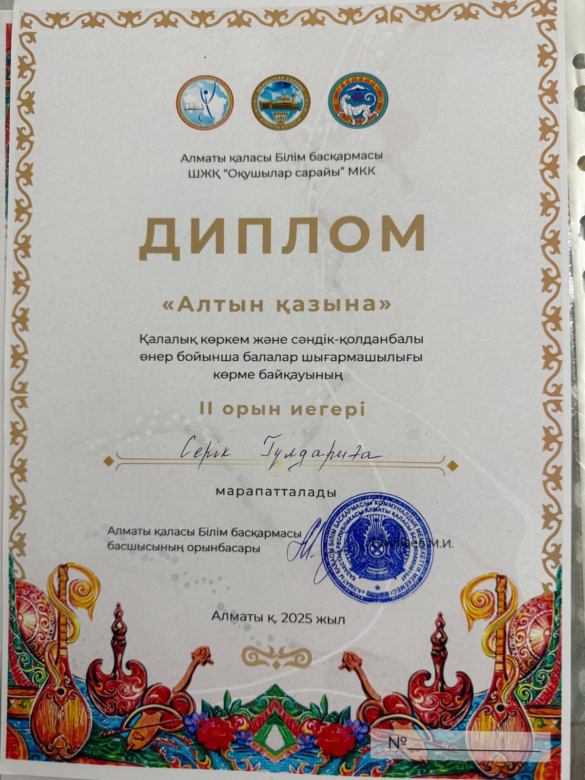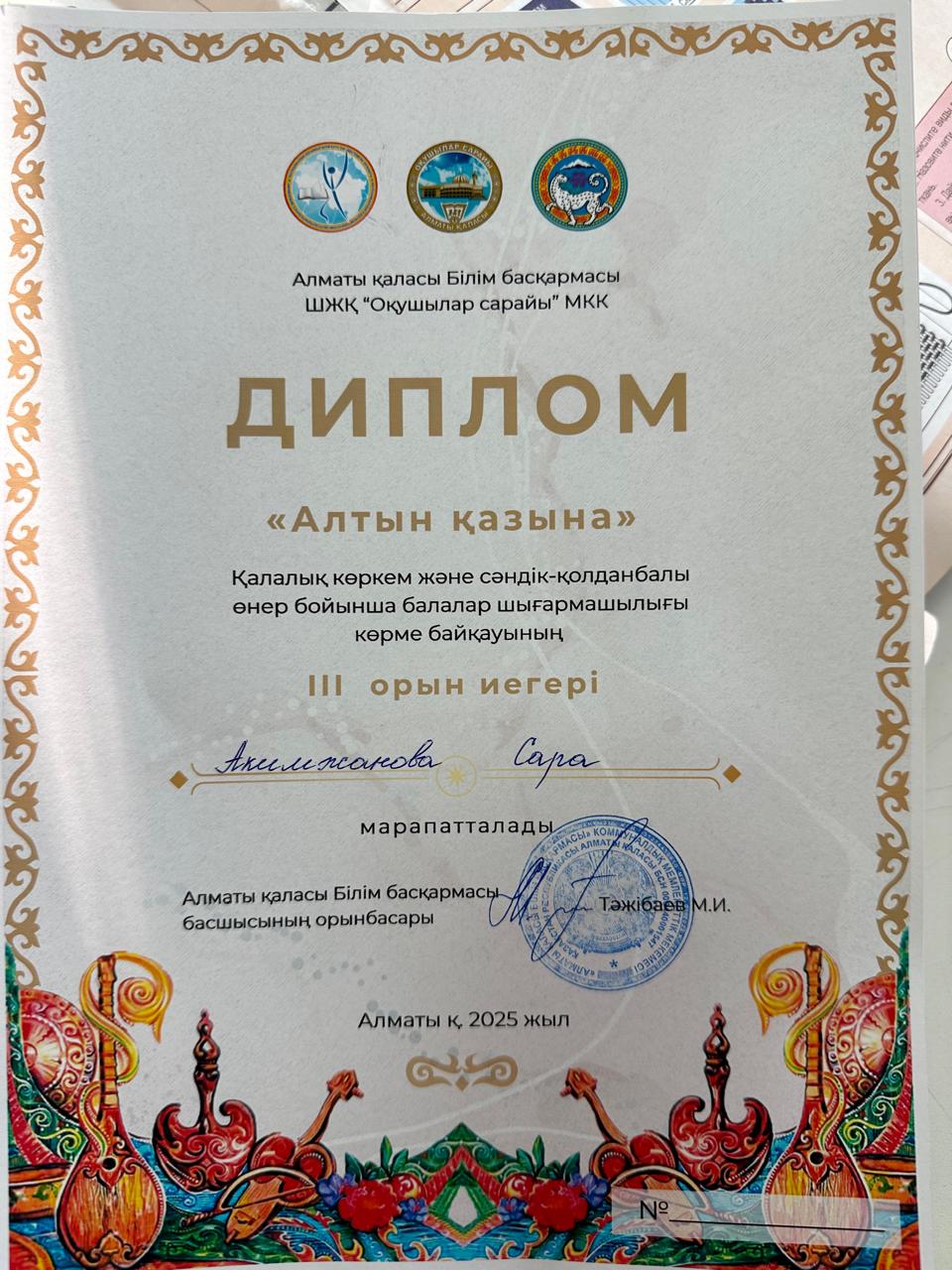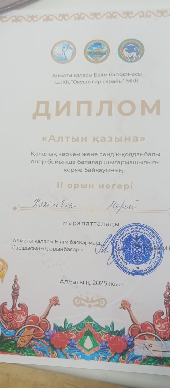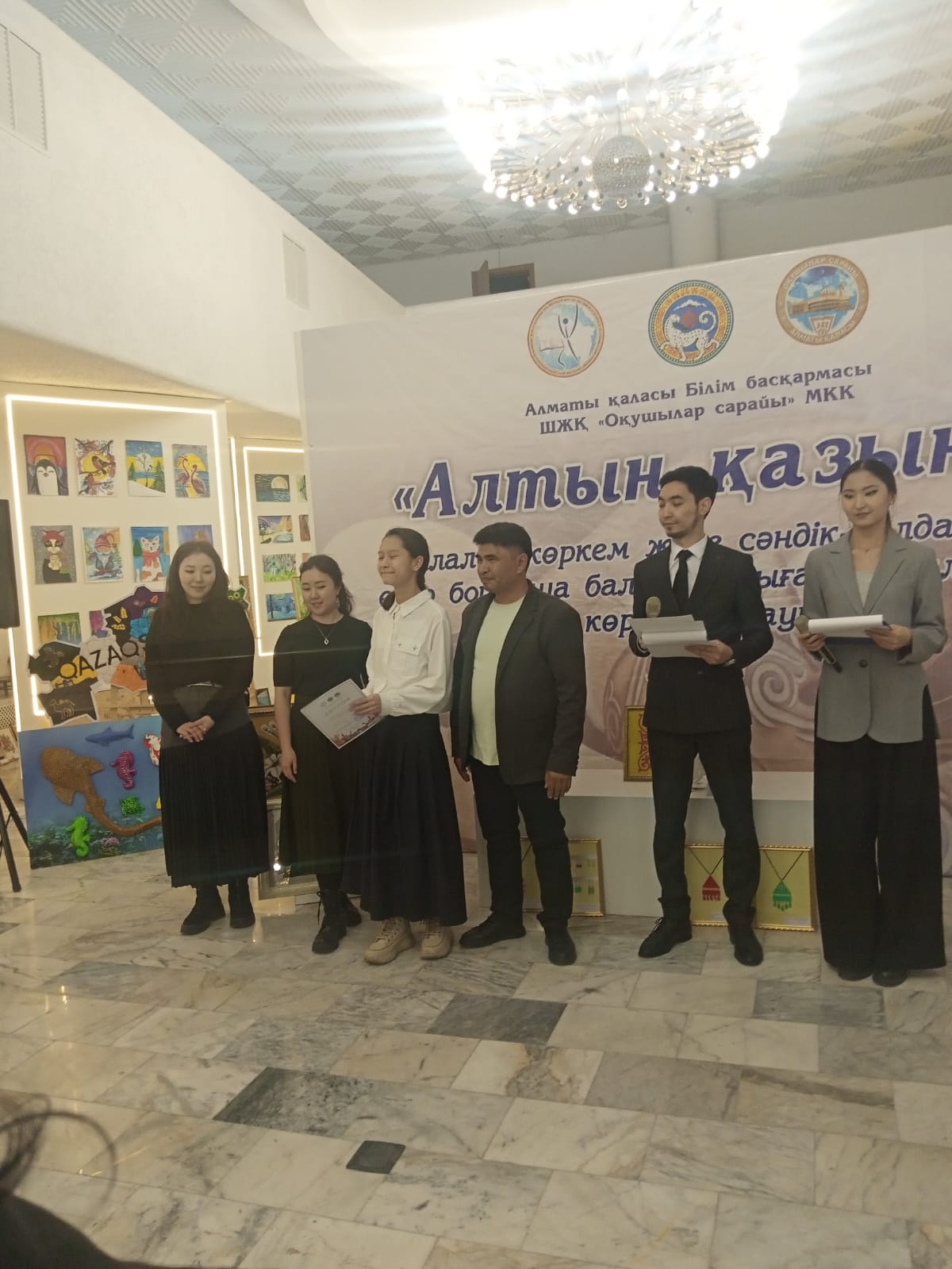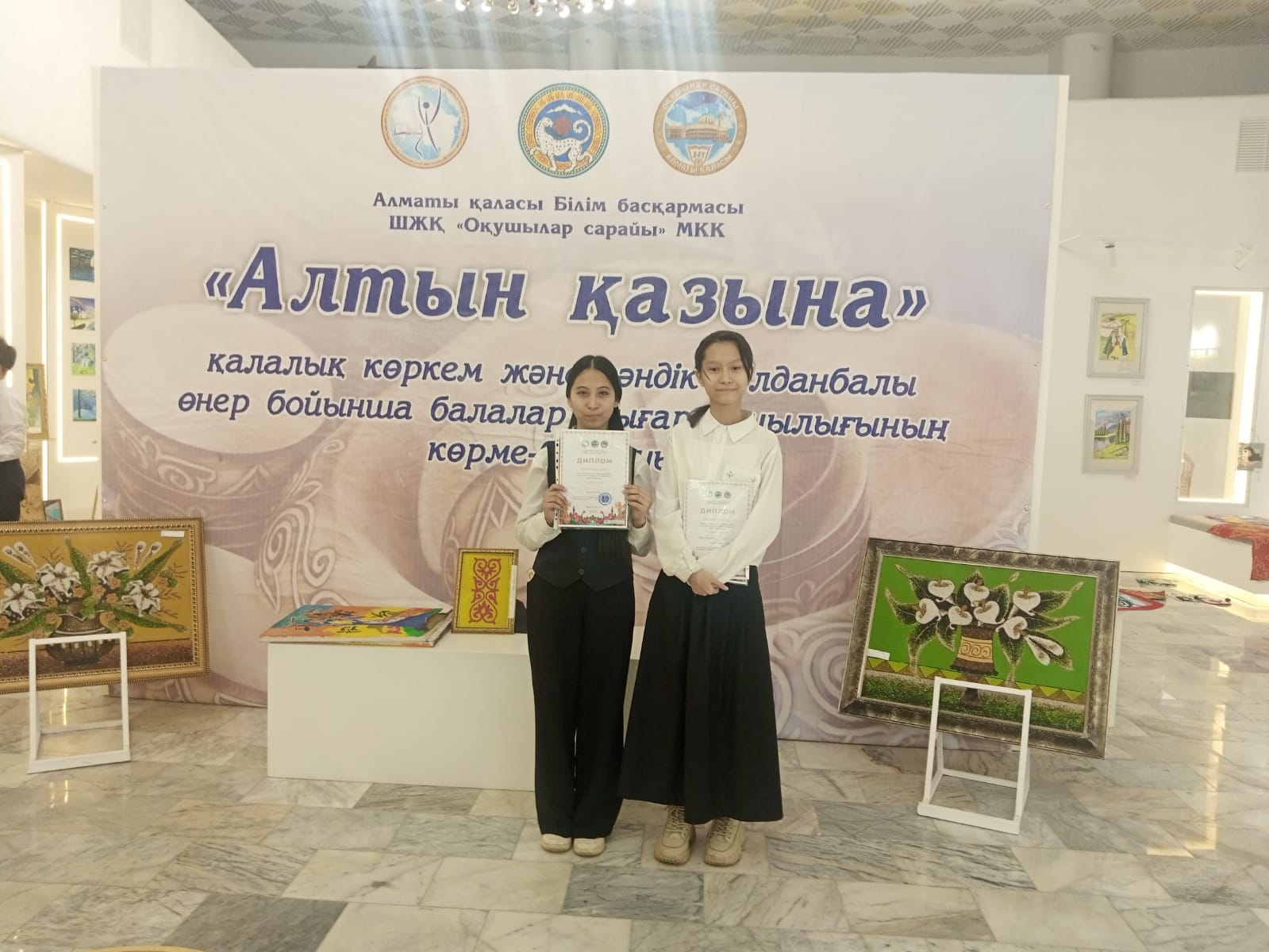 Алматы қаласы білім басқармасы ШЖҚ Оқушылар сарайы МКК «Алтын қазына» қалалық көркем және сәндік қолданбалы өнер бойынша балалар шығармашылығы көрме байқауына қатысып, Жетису ауданы N110 мектеп-гимназиясының