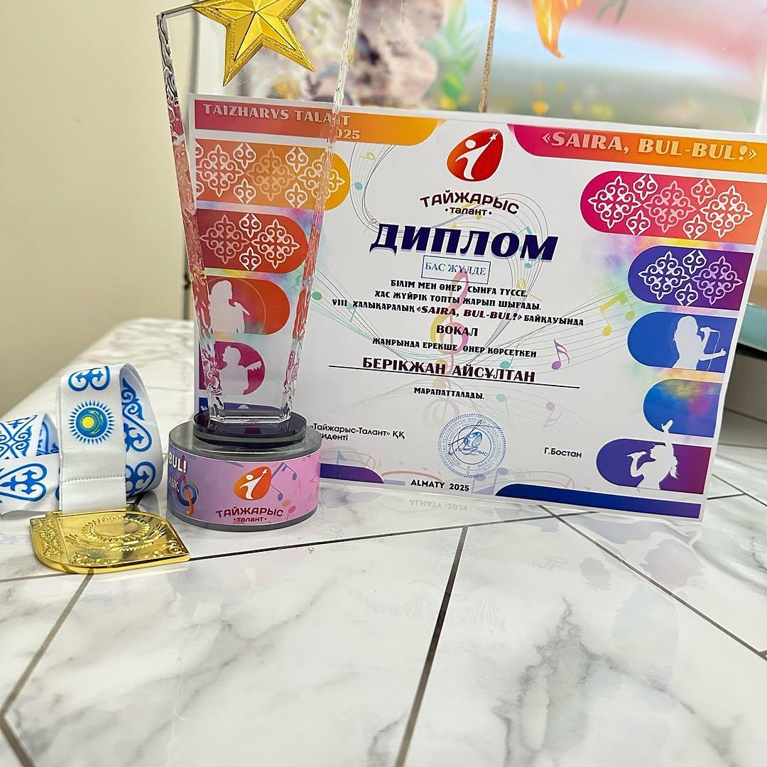 VIII Халықаралық’Тайжарыс””Сайра бұлбұл”байқауында вокал номинациясы бойынша ерекше өнер көрсеткен Жетісу ауданы N110 мектеп- гимназияның 3”Г” сынып оқушысы Берікжан Айсұлтан БАС ЖҮЛДЕНІ жеңіп алып, Түркі еліне жолдама алды. Жетекшісі музыка пәні мұғалімі, Оразбаева Ляззат Камитовна.