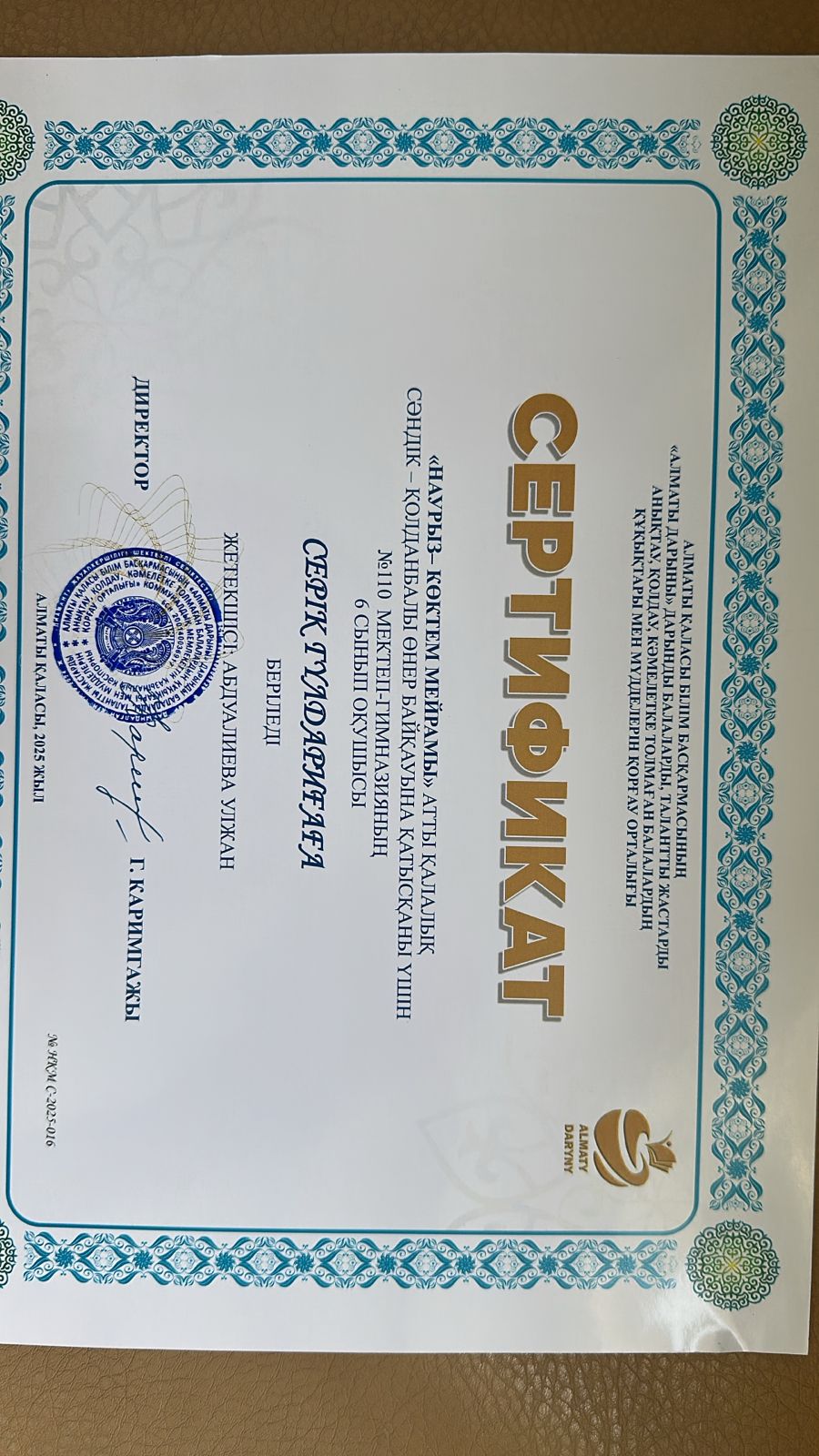 Көктем мерекесіне арналған “Наурыз - көктем мейрамы” атты қалалық сәндік - қолданбалы өнер байқауының “Авторлық ойыншықтар” бағыты бойынша жүлдегері N110 мектеп- гимназияның 6 сынып оқушысы Серік Гүлдариға ІІІ Дәрежелі дипломмен марапатталды.