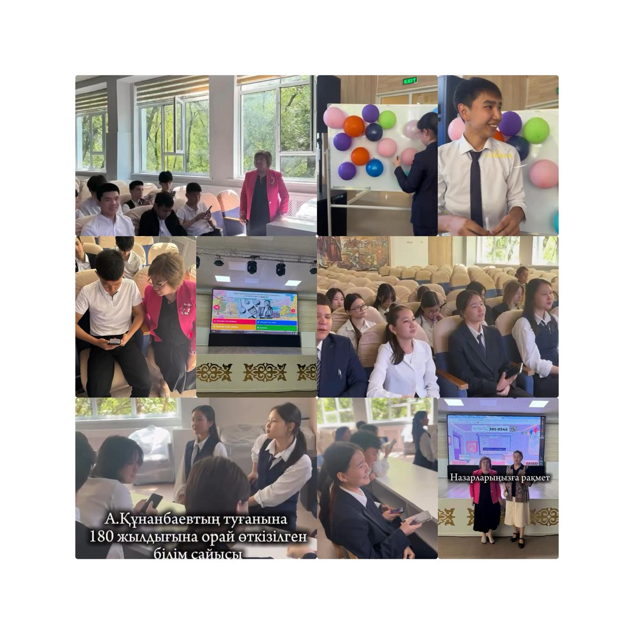 21 мамыр күні №110 мектеп-гимназиямызда қазақтың ұлы ақыны Абай Құнанбайұлының 180 жылдығына орай 10 “В”және 10 “Г “ (оқу тілі орыс тілінде)сыныптары арасында “Абай trivia “ Kahoot , Quizizz платформасындағы онлайн-викторина сайысы өтті.”Абай Құнанбаевтың 180 жылдығына арналған Kahoot және Quizizz платформаларындағы онлайн-викторинасы өте әсерлі өтті. Ұлы ойшылдың өмірі мен шығармашылығын тануда осындай заманауи тәсілдер жастарға ерекше қызықты. Рухани жаңғыру жолындағы маңызды қадам!
