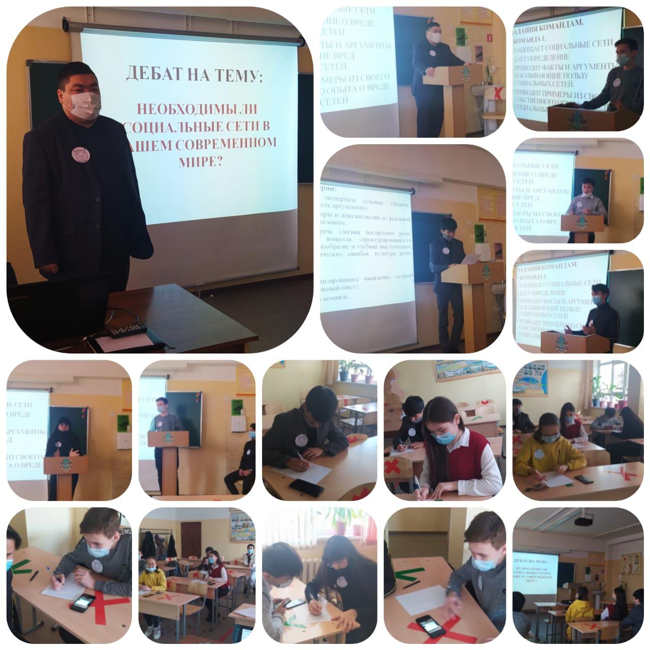 Сегодня, 5 февраля, в рамках школьного дебатного клуба "ИРБИС", состоялись дебаты среди участников клуба на тему: "Необходимы ли социальные сети в нашем современном мире?". Участники, по правилам дебатов, были разделены на две команды: первая команда была на защите социальных сетей, определила факты и аргументы о пользе социальных сетей, привела примеры из собственной жизни о пользе социальных сетей; когда вторая команда представляла и доказывала точку зрения о вреде социальных сетей, привела контраргументы против первой команды, также привела примеры из собственной жизни о вреде социальных сетей. После выступлений двух команд, участники стали задавать острые вопросы друг другу. Цель дебатов - отстоять свою точку зрения и убедить третьи лица в своей правоте. Коллегия жюри определила победителя в данном ораторском противостоянии - ей стала вторая команда. Участники клуба - это учащиеся 9-10 классов школы. На дебатах были соблюдены все санитарно-эпидемиологические правила. Ответственный руководитель клуба - учитель по истории Садыбеков И. С.