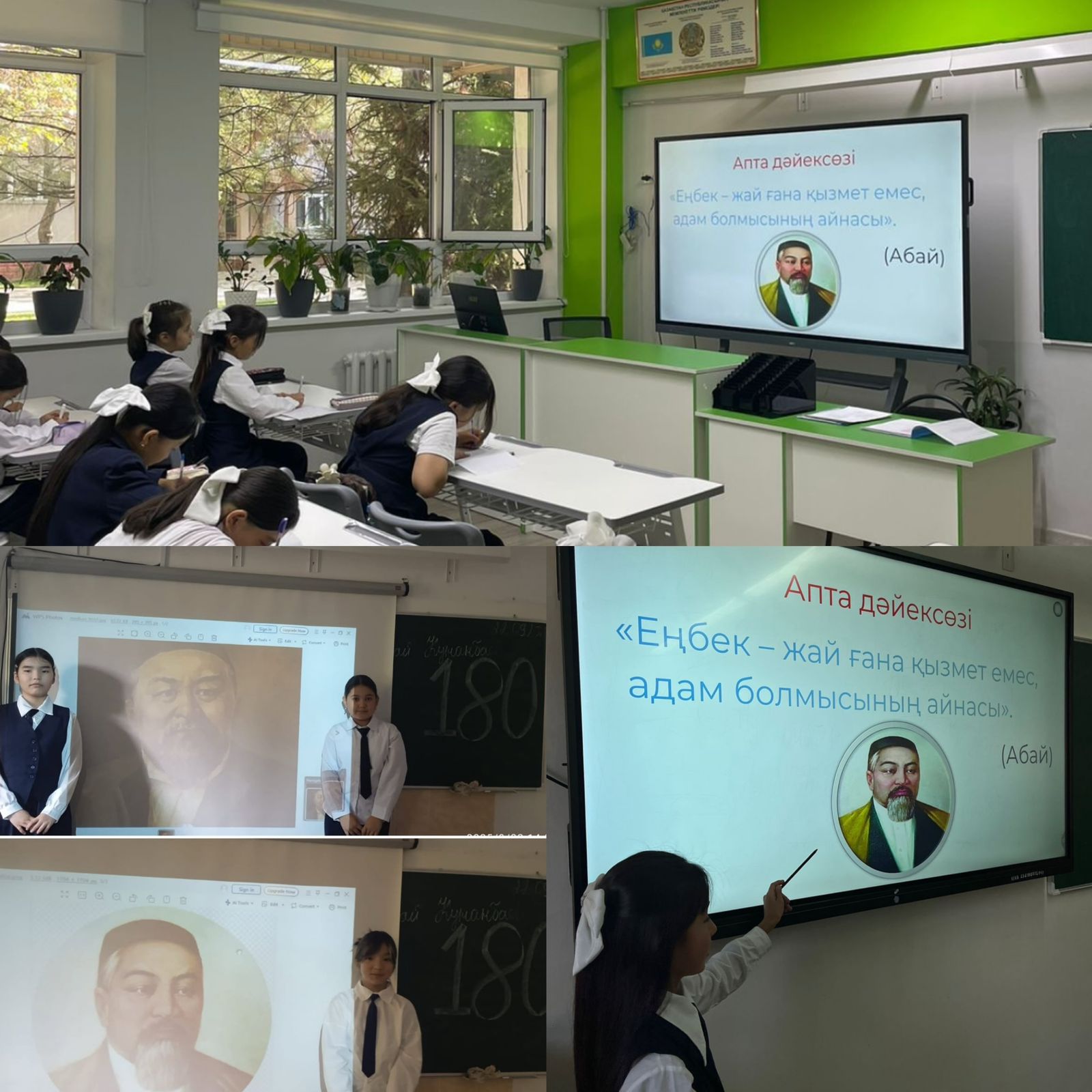 №110 мектеп-гимназиясында қазақтың ұлы ақыны, ағартушы Абай Құнанбайұлының туғанына 180 жыл толуына орай сынып сағаттары өткізілді.