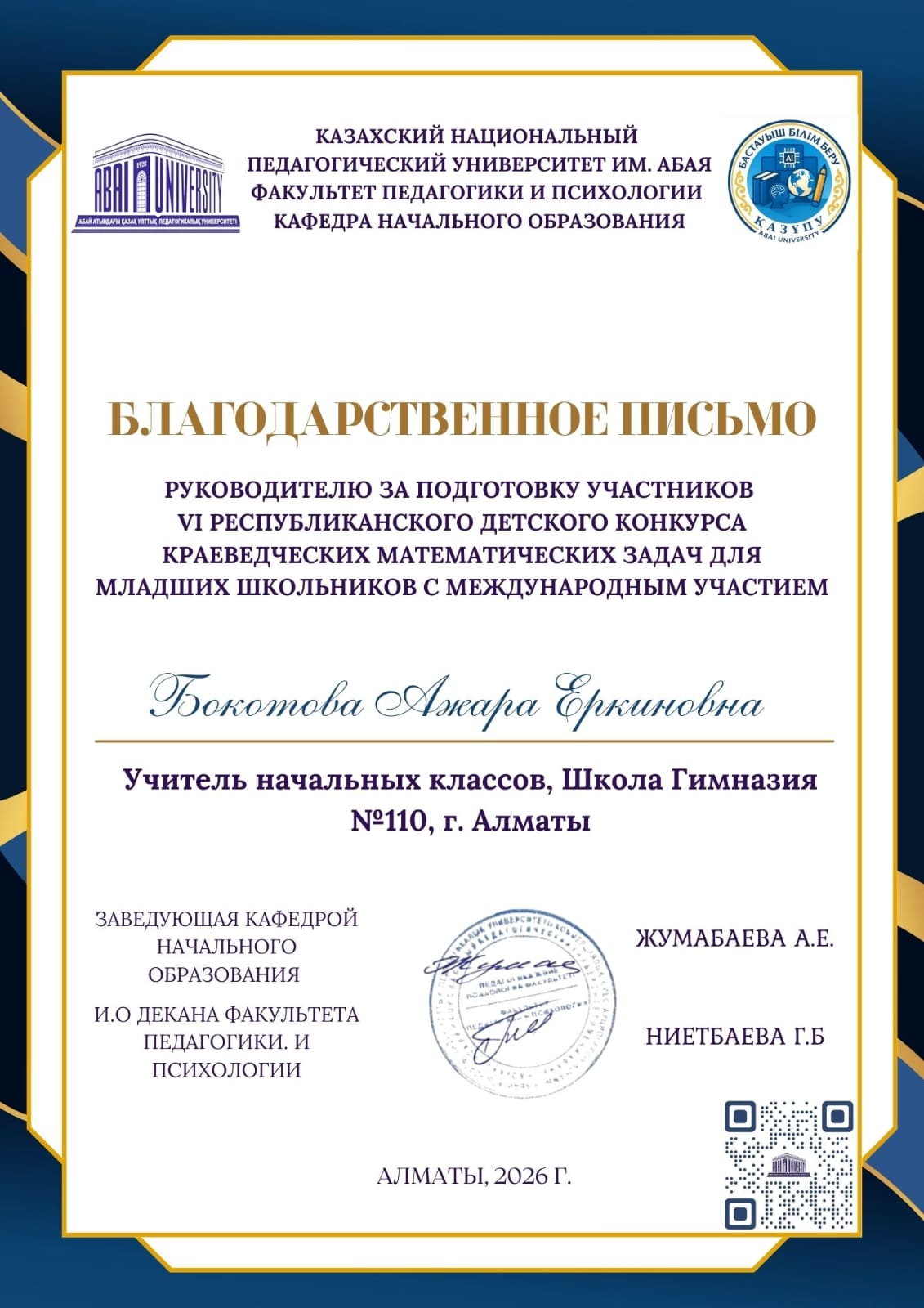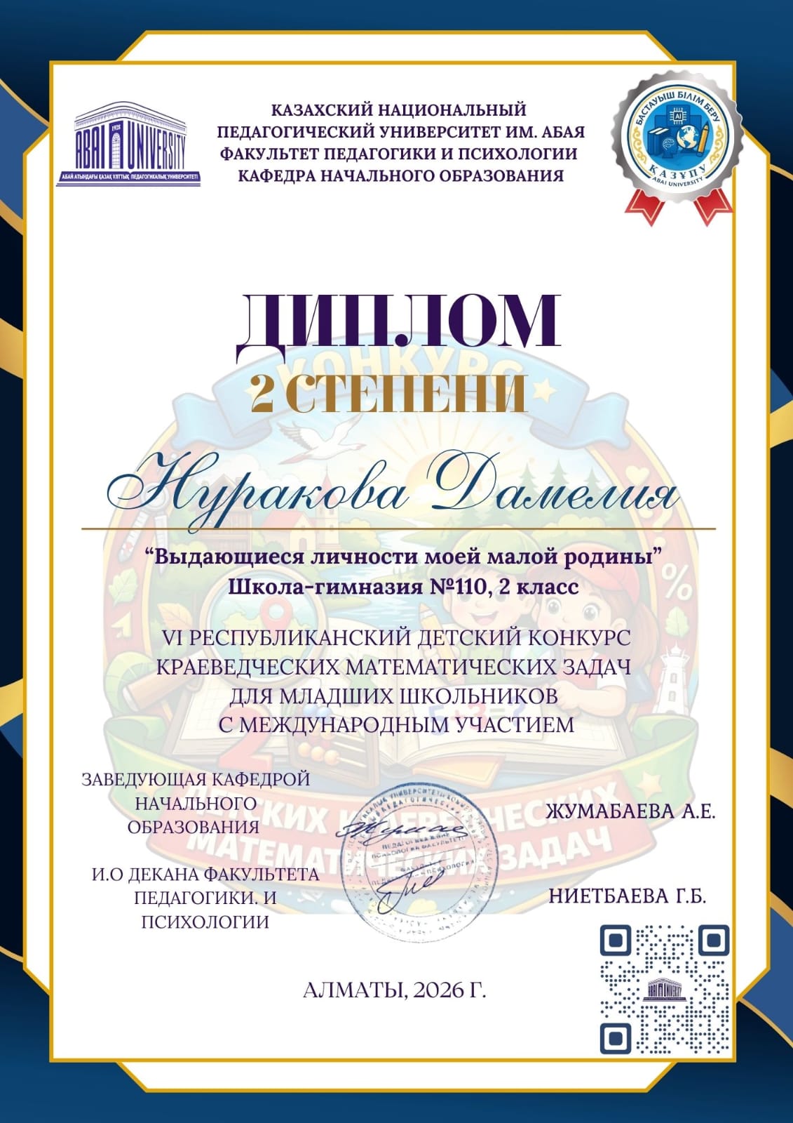 Дипломом 2 степени награждаются ученики 2"З"класса Тань Руслан и Нуракова Дамелия."Подвиг моего народа в годы ВОВ". Республиканский детский конкурс краеведческих математических задач для младших школьников с международным участием.КЛ.РУК: Бокотова А.Е.
