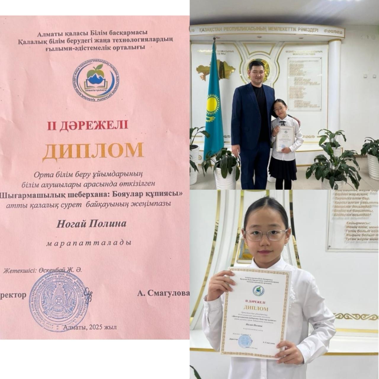 Алматы қаласы Білім басқармасы Қалалық білім берудегі жаңа технологиялардың ғылыми-әдістемелік орталығы "Шығармашылық шеберхана: Бояулар құпиясы" атты қалалық сурет байқауының 2 дәрежелі диплом жеңімпазы Ногай АружанЖетекшісі: Өскенбай Ж.Ә.