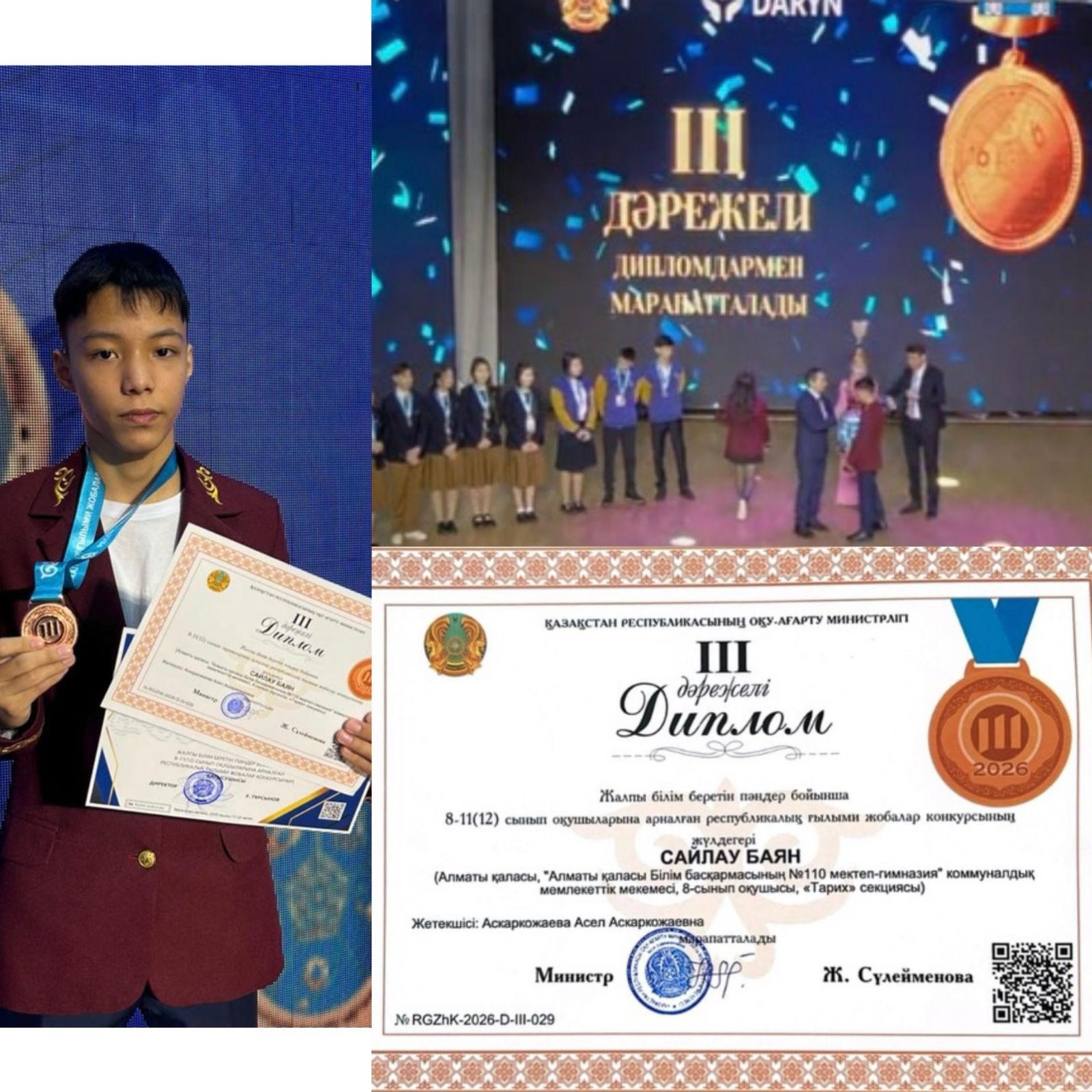 2026 жылдың 17-20 ақпан аралығында өткен жалпы білім беретін пәндер бойынша оқушылардың Республикалық ғылыми жобалар конкурсында №110 мектеп-гимназияның 8-сынып оқушысы Сайлау Баян "Тарих" секциясы бойынша ІІІ дәрежелі дипломмен марапатталды.
