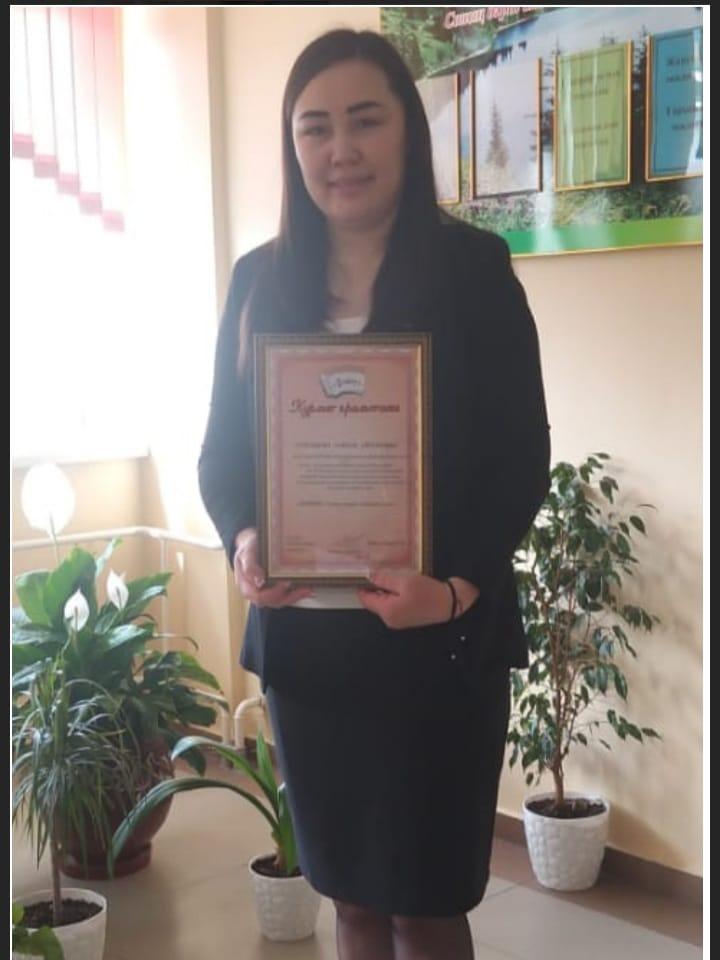•Благодарность за руководство научной работой, занявшей I место на городском конкурсе научных работ «Тұран - Junior» (секция «Математика, информатика»);