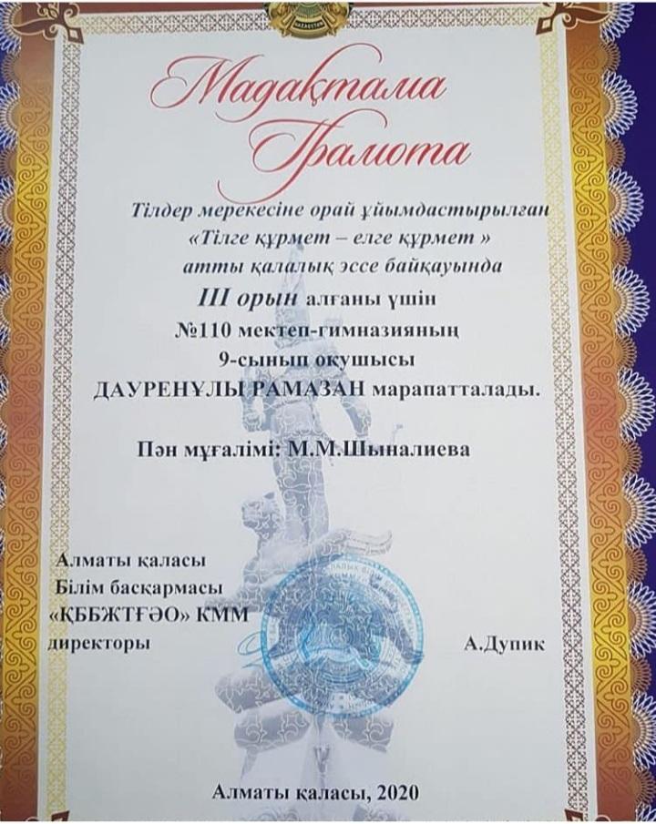 Тілдер мерекесіне орай ұйымдастырылған "Тілге құрмет -елге құрмет" атты қалалық эссе байқауында III орын алғаны үшін Жетісу ауданы #110 мектеп-гимназиясының 9"В" сынып оқушысы Дәуренұлы Рамазан марапатталды. Жауапты қазақ тілі мен әдебиеті пәнінің мұғалімі Шыналиева Маржан.