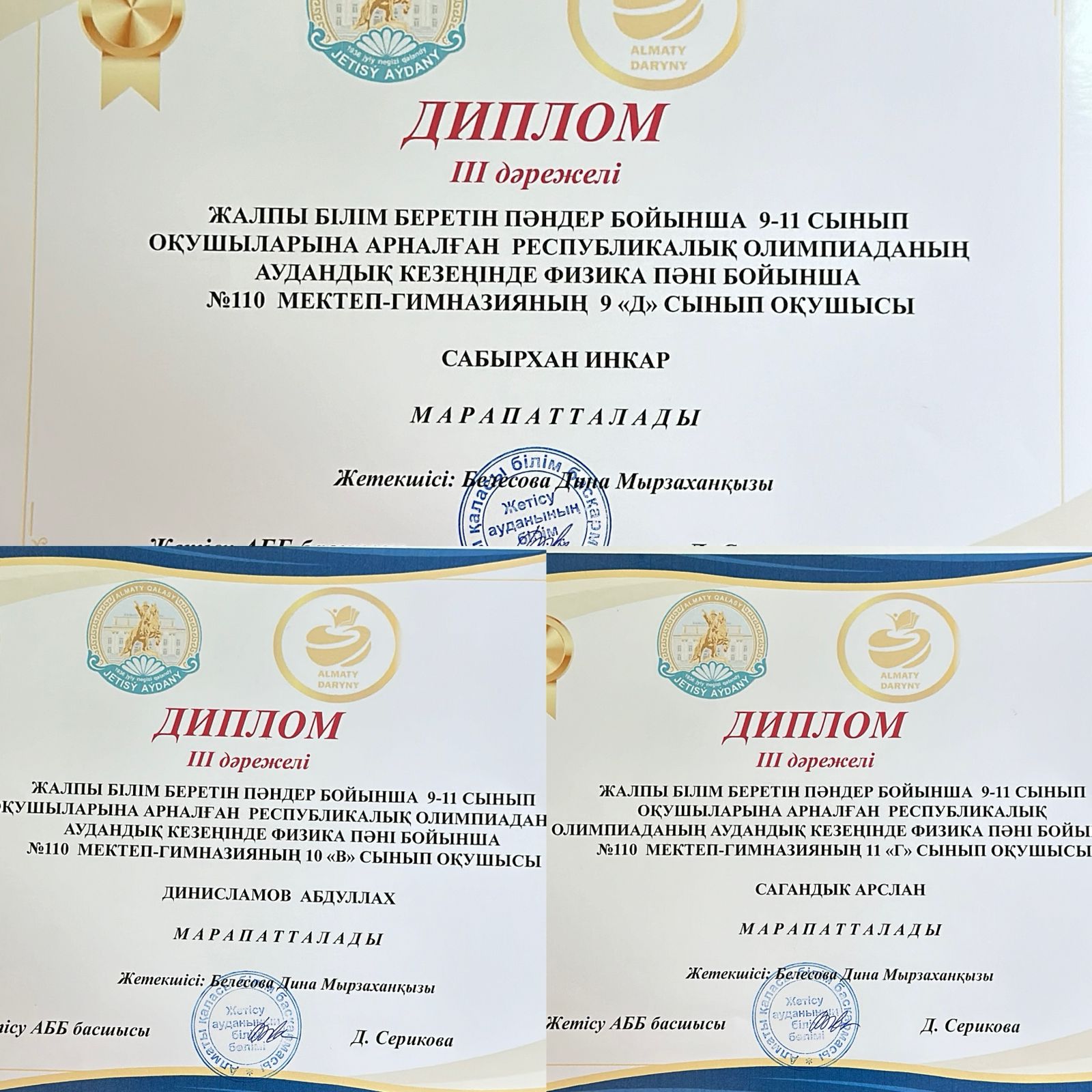Жалпы білім беретін пәндер бойынша 5 - 11 сынып оқушыларына арналған республикалық олимпиаданың аудандық кезеңінде физика пәні бойынша №110 мектеп-гимназиясының9 сынып оқушысы: