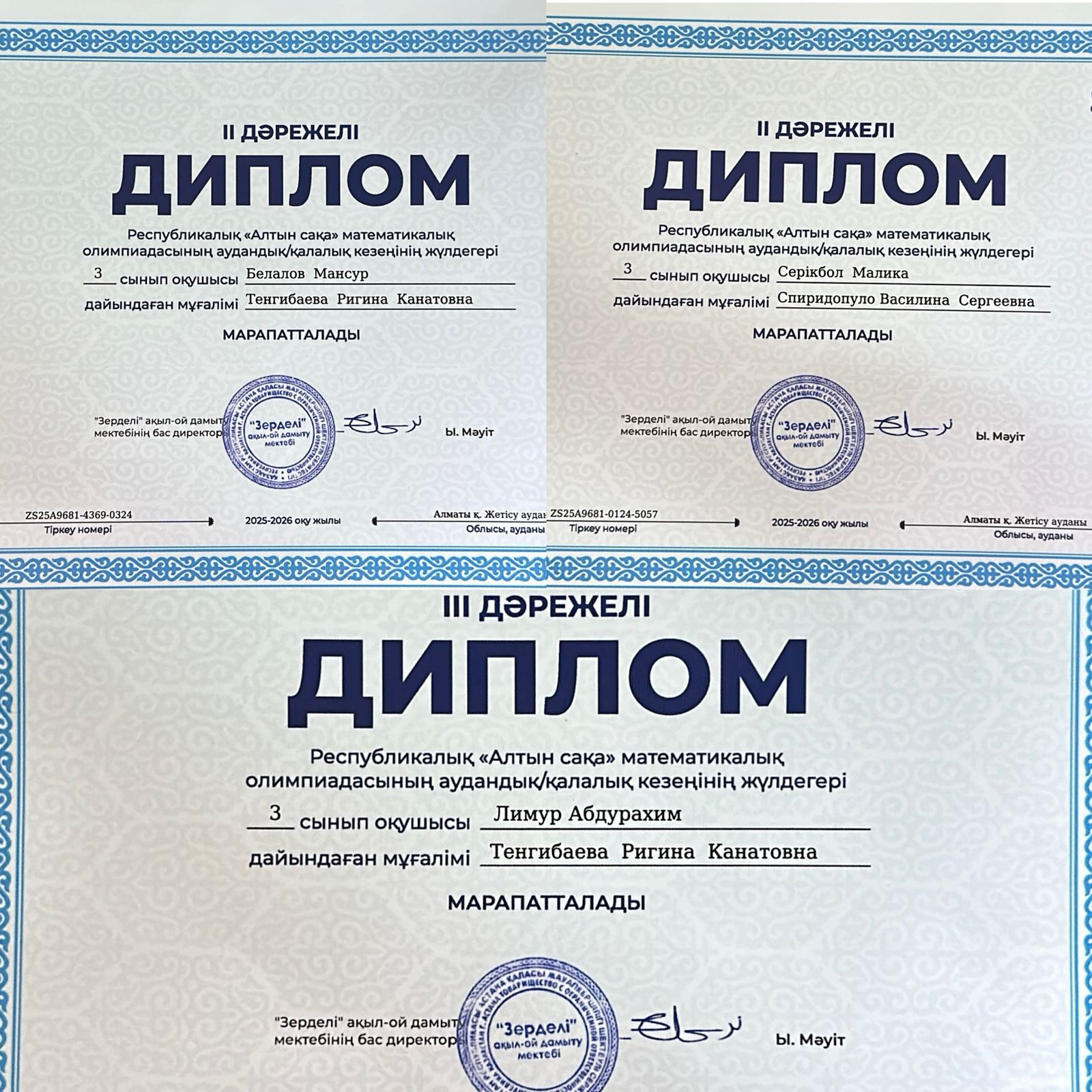 Республикалық «Алтын сақа» математикалық олимпиадасының аудандық/қалалық кезеңінің ІІ дәрежелі жүлдегері 3 сынып оқушысы Белалов Мансур Жетекшісі: Тенгибаева Р.К. ІІІ дәрежелі жүлдегері 3 сынып оқушысы Лимур Абдурахим Жетекшісі: Тенгибаева Р.К. ІІ дәрежелі жүлдегері 3 сынып оқушысы Серікбол Малика Жетекшісі: Спиридопуло В.С. Құттықтаймыз.