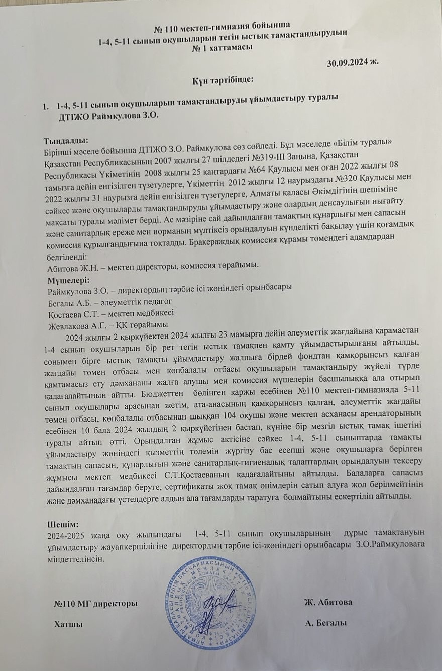 30 қыркүйек 2024 0 1 2 3 4 5 № 110 мектеп-гимназия бойынша 1-4, 5-11 сынып оқушыларын тегін ыстық тамақтандырудың № 1 хаттамасы Осы беттің QR-коды:QR-код этой страницы: