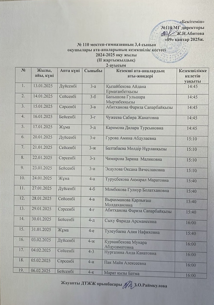 25 ақпан 2025 0 1 2 3 4 5 № 110 мектеп-гимназияның 1-4 сынып оқушылары ата-аналарының кезекшілік кестесі 2024-2025 оқу жылы (ІІ жартыжылдық) 1-ауысым Осы беттің QR-коды:QR-код этой страницы: