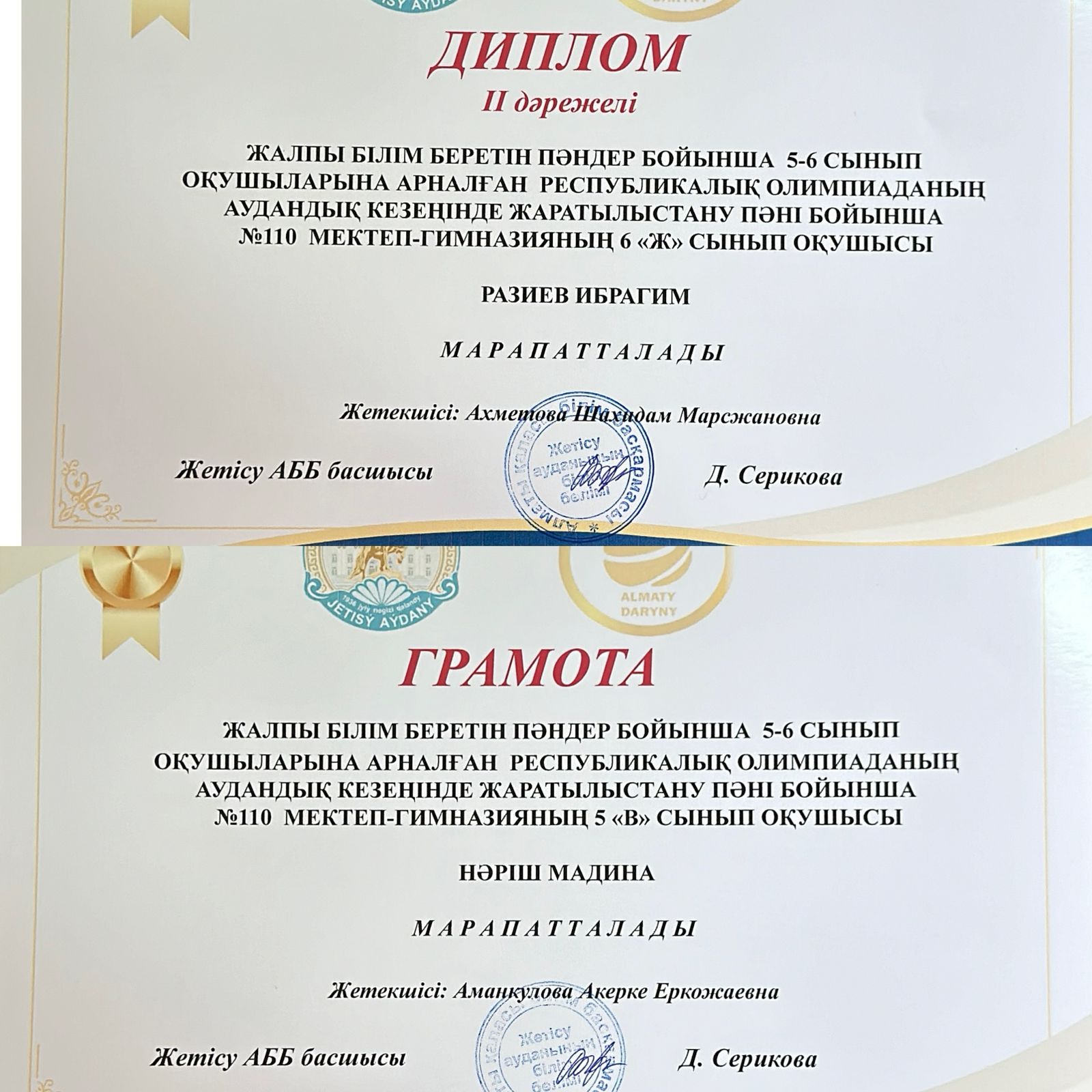 Жалпы білім беретін пәндер бойынша 5 - 6 сынып оқушыларына арналған республикалық олимпиаданың аудандық кезеңінде жаратылыстану пәні бойынша №110 мектеп-гимназиясының