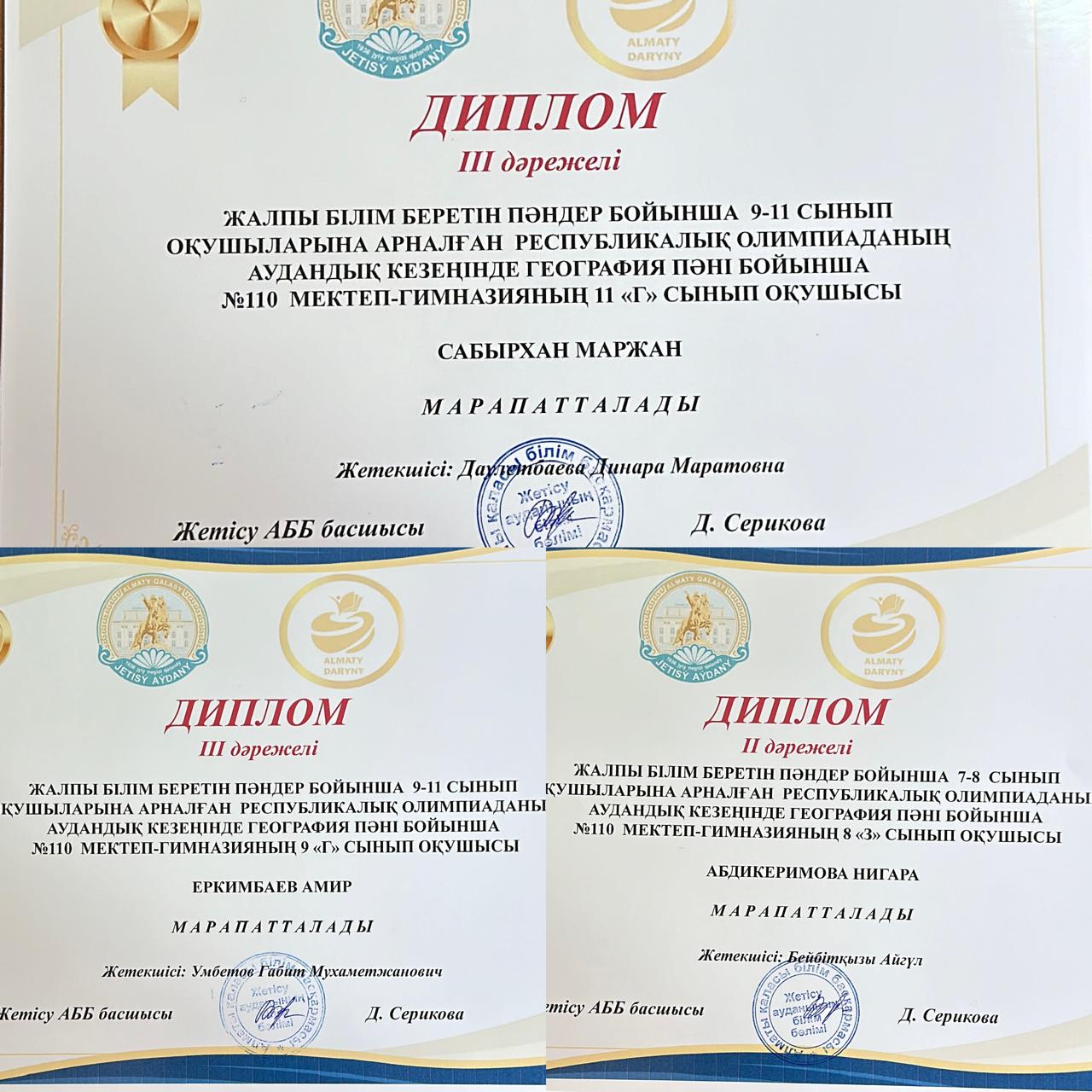 Жалпы білім беретін пәндер бойынша 5 - 11 сынып оқушыларына арналған республикалық олимпиаданың аудандық кезеңінде география пәні бойынша №110 мектеп-гимназиясының